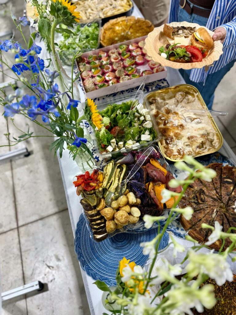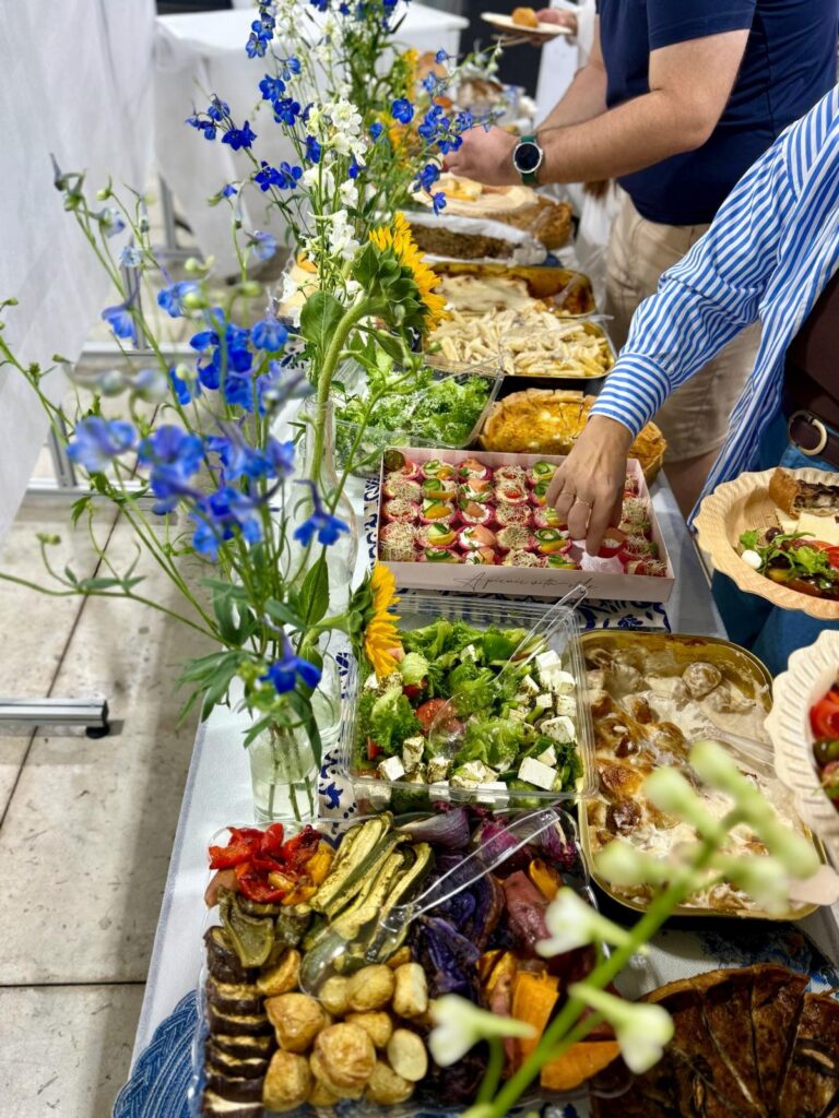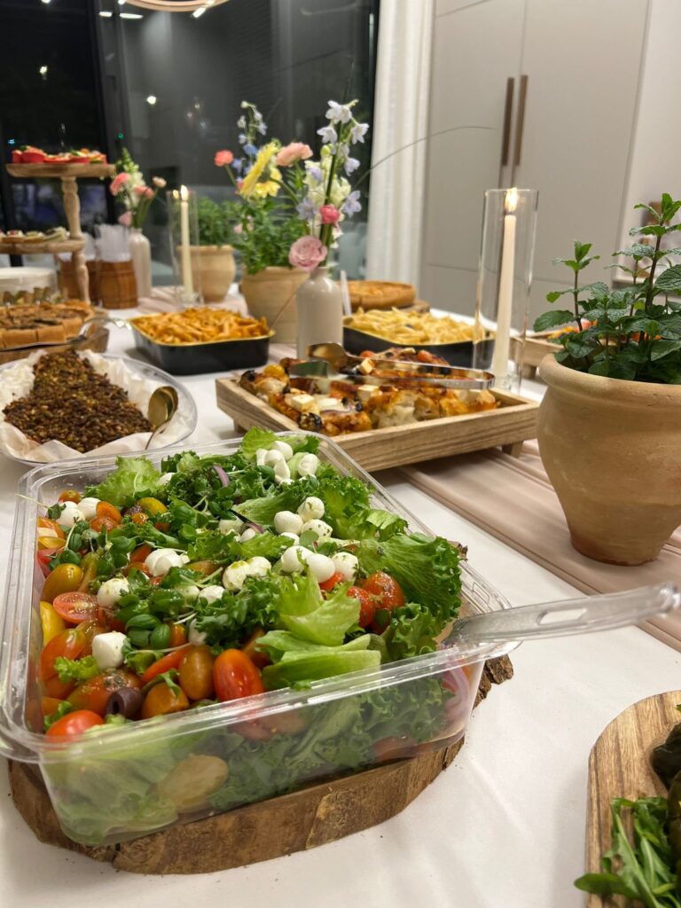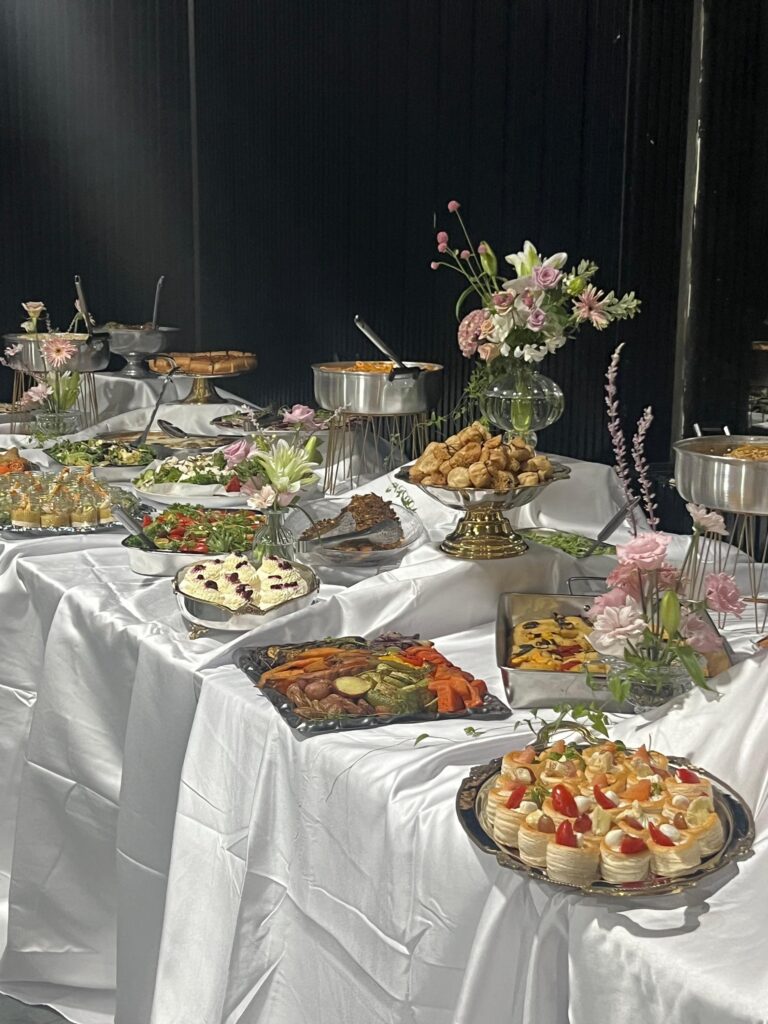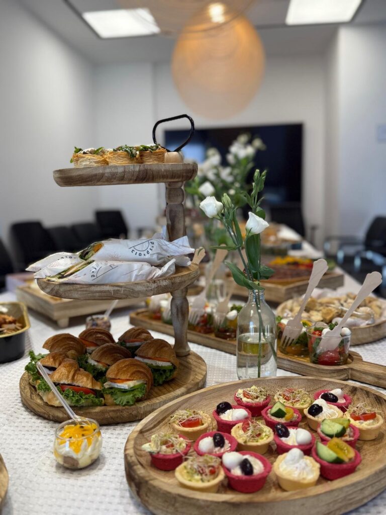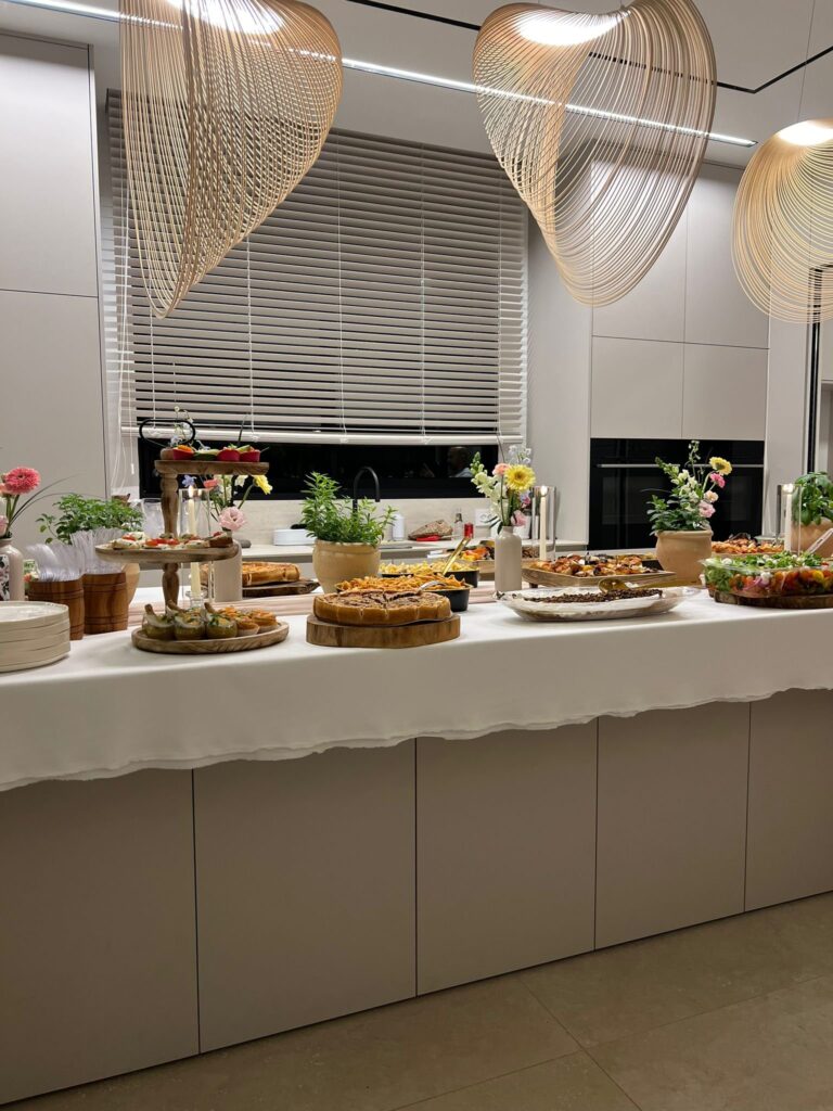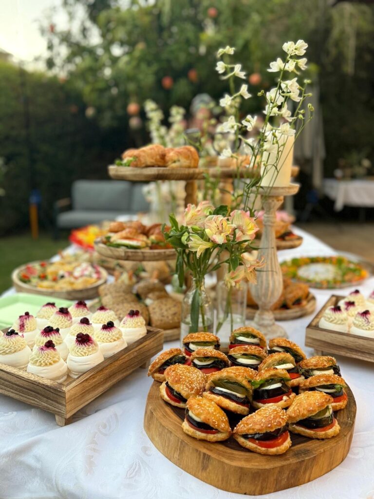 מגוון מגשי אירוח מעוצבים בקפידה, הכוללים גבינות מובחרות, דגים טריים, כריכים יצירתיים, מאפים, סלטים, מנות עיקריות, פינגר פוד, קישים ולזניות.
